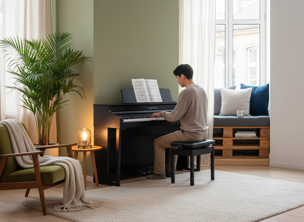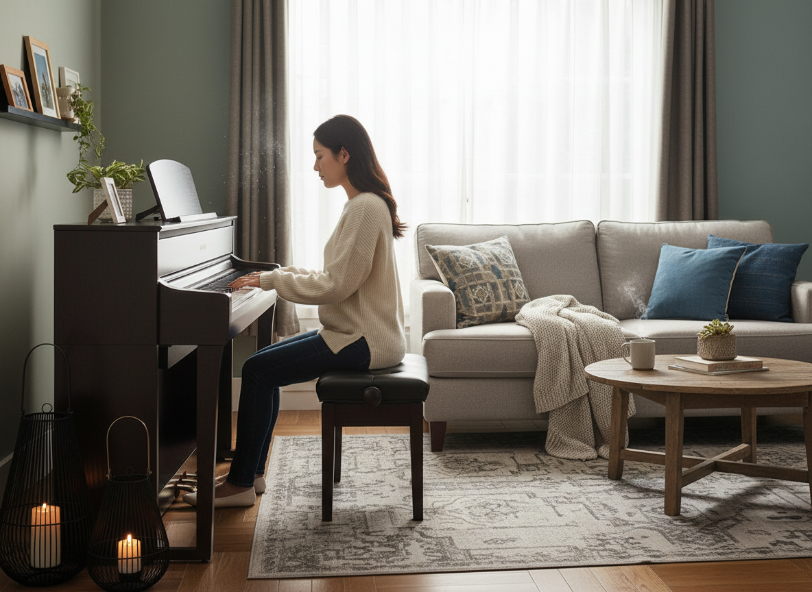 這種設計非常符合當代生活型態。許多家庭不再擁有獨立琴房,而是希望鋼琴能自然融入生活動線,不佔據整個牆面,也不壓縮家具配置。窄身電鋼琴因此成為初學者與城市家庭的重要選項,讓學琴不再等同於為一件大型家具重新規劃空間。
